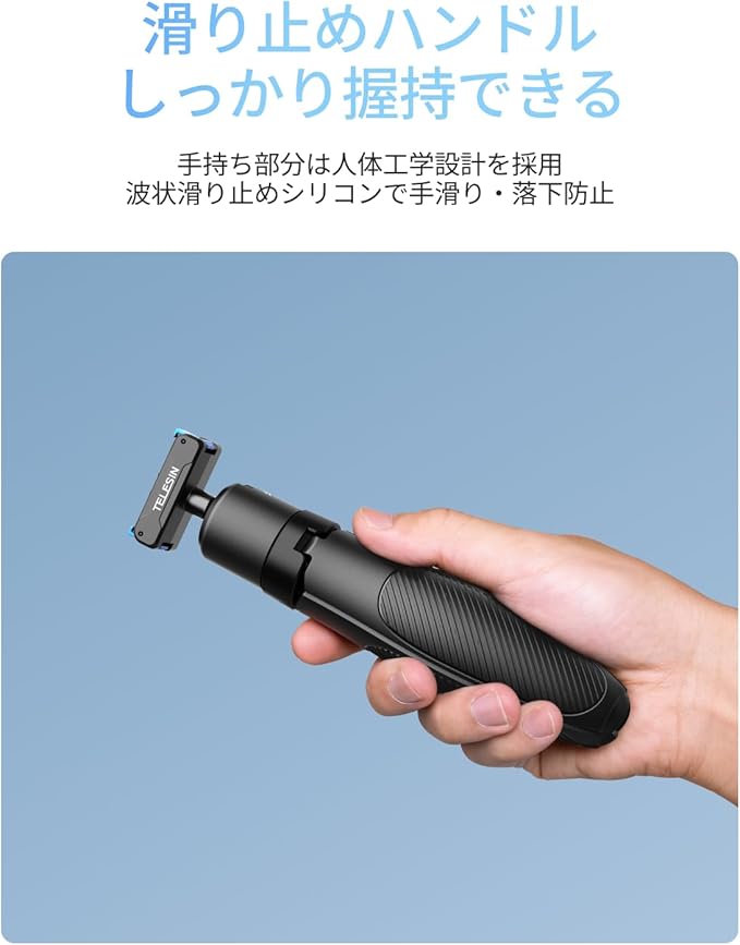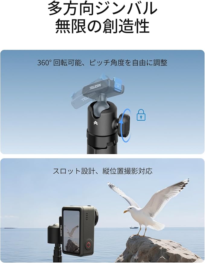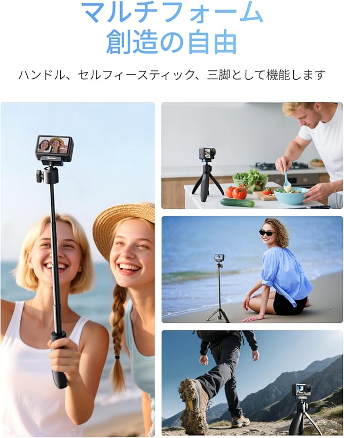 【多様な撮影モード】 ハンドル、セルフィー棒、三脚の機能を兼ね備えています。ハンドルモードはスポーツ追跡撮影に最適、セルフィー棒モードは広角撮影を容易に、三脚モードはデバイスを安定して支え、タイムラプス撮影や固定カメラ位置撮影などに役立ちます。1つの製品で複数の機能を実現し、アクセサリーの持ち運び負担を軽減。家族集まり、アウトドア撮影、日常の記録など、多様な創作ニーズに対応し、より多くの撮影アイデアを解放します。