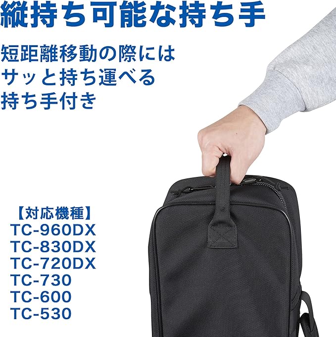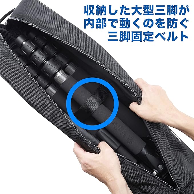 TC-DXシリーズはケース内で三脚を保持できる三脚固定ベルト付。