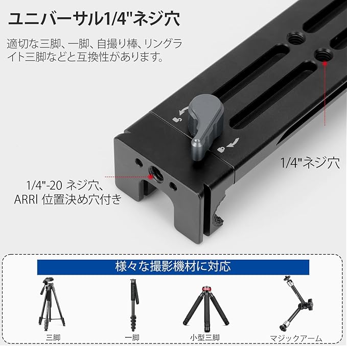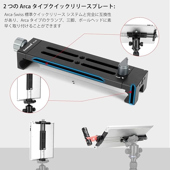 【多様な取り付けオプション】底面と背面にARCA規格のダブテールを装備し、ARCA-Swissクイックリリースシステムと完全に互換性があります。Acra三脚や一脚への素早い取り付けが可能です。クランプの底面と背面には1/4"ネジ穴を備え、タブレットやiPadを三脚、一脚、フレックスポッド、または標準の1/4" ネジ対応マウントに簡単に取り付けることができ、写真撮影、ビデオ撮影、日常の作業にシームレスに使用できます。