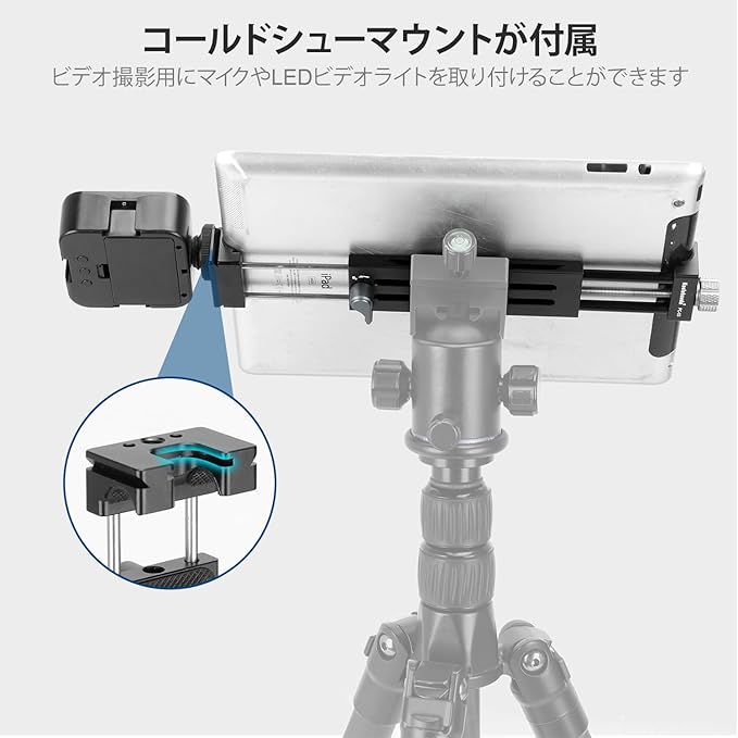 【コールドシューマウント】PC-03 iPadホルダーは底面のコールドシューにマイクやLEDビデオライトを取り付けて動画撮影が可能で、動画の画質を向上できます。
