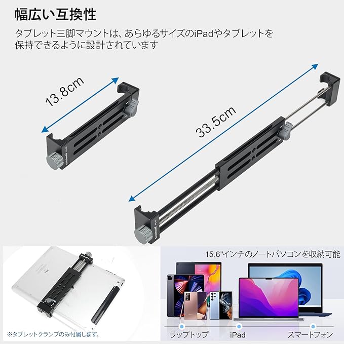 【幅広い互換性】ホルダークランプの幅は13.8cm~33.5cmまで調整可能。超広範囲のクランプ範囲により、市販のほとんどのタブレットを縦置き・横置きどちらでも固定できます。iPad Mini、iPad Pro、iPad Air、iPad 1~9シリーズ、スマートフォンなどに最適です。15.6" ノートパソコンの固定にも適しています。
