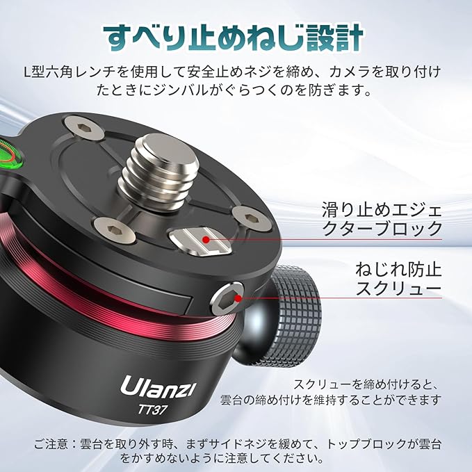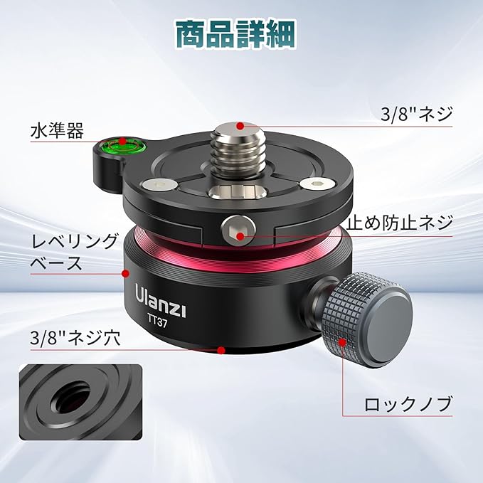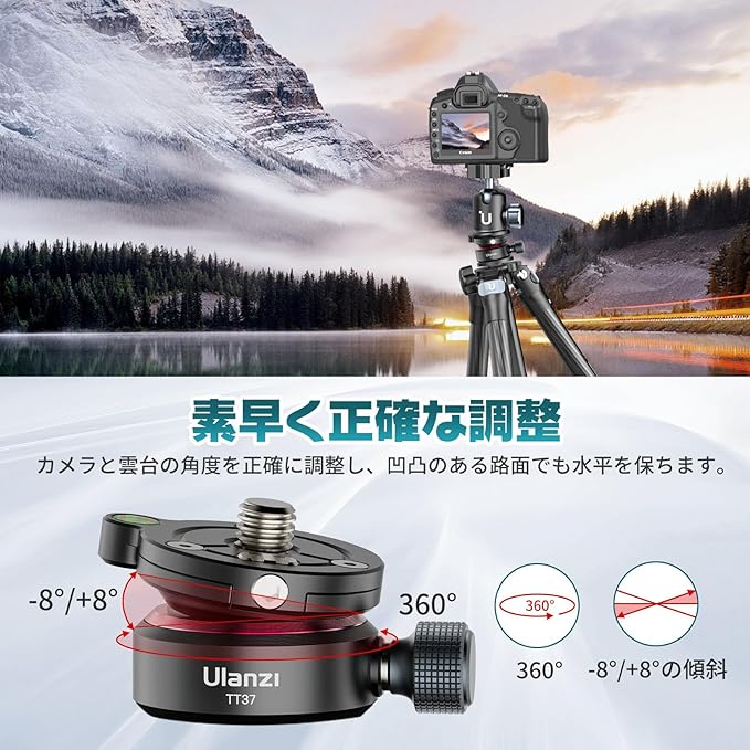 【三脚レベリングベース&8 上下傾斜】Ulanzi 水平調整雲台TT37は、12 /+12 の傾斜設計を採用されて、360 のパン動作に加えて、より高い安定性と柔軟な撮影角度を提供します。パノラマシステムを平坦化するためのツールであり、三脚を組み合わせて風景撮影に使用することで、特に屋外で平坦でない地上撮影に適した容易かつ正確なレベル調整が可能です。