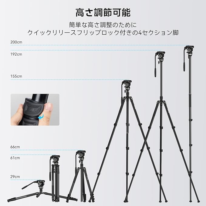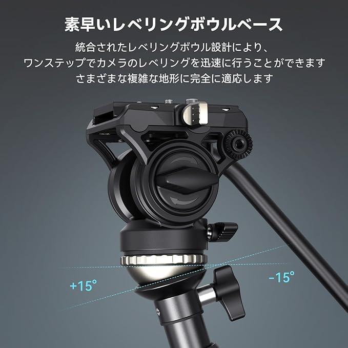 【プロフェッショナルフルードヘッド】ヘッドの底部ベースは新しい構造設計を採用しており、位置合わせなしで簡単に取り付けることができ、従来のスライドベースのクイックリリース機構よりも効率的です。 ジンバルはチルト/パンダンピングが固定されており、90 /-65 のチルトと360 の回転が可能で、さまざまな角度で安定した撮影を実現します。 また、統合されたレベリングベースを備えており、 15 の傾斜範囲調整が可能で、素早いレベリングが可能です。
