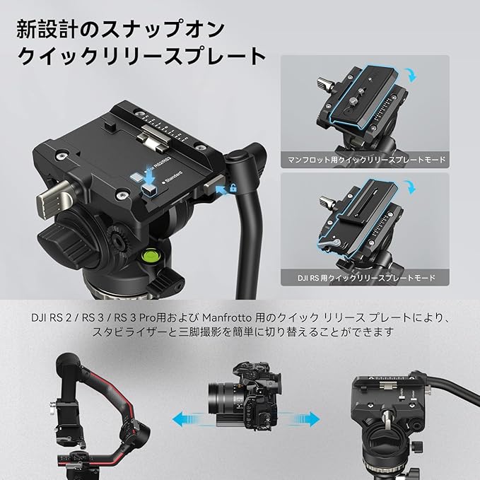 【デュアルモードクイックリリースプレート搭載】ジンバルはDJI RS 2 / RS 3 / RS 3 Pro用クイックリリースプレートおよび標準的なManfrotto用クイックリリースプレートと互換性があり、撮影中にスタビライザーと三脚を素早く切り替える機能が可能、Manfrottoクイックリリースプレートを搭載リリース プレート (標準パターン) には 1/4"-20 および 3/8-16 ネジが付いており、ビデオ ヘッドはほとんどのカメラと互換性があります。