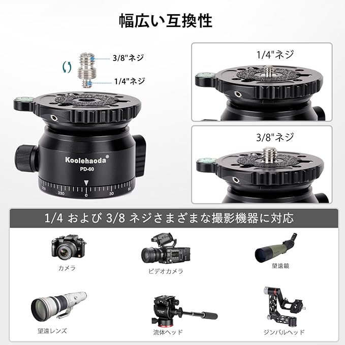 上部の3/8"ネジは、ほとんどの写真ヘッドに取り付けることができます。下部の直径60mmおよび3/8"のネジ穴(3/8 "から1/4"のネジアダプターが付属)は、ほとんどの三脚に適用できます。