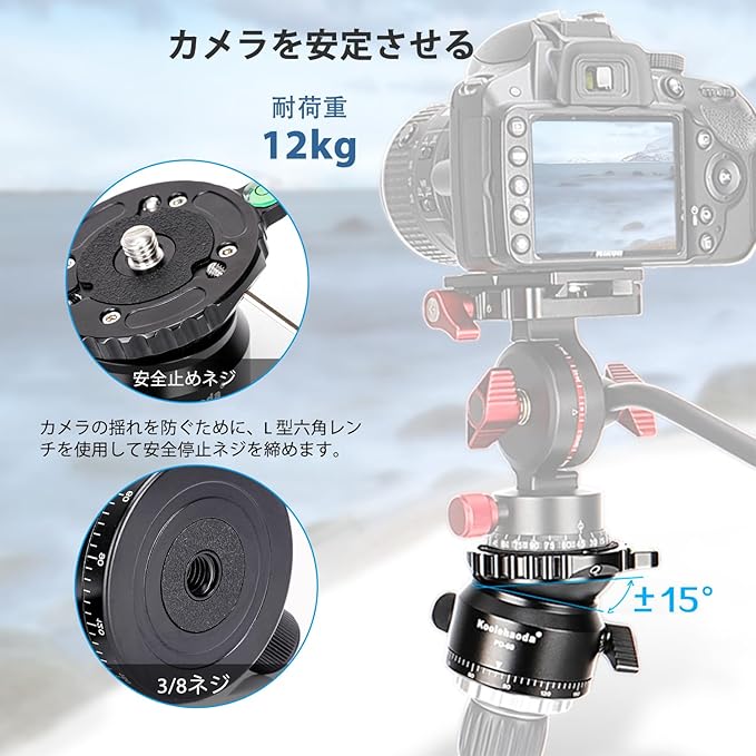 半球ヘッド設計、あらゆる方向にスムーズな360 回転と15 傾斜をサポート。最大12kgの耐荷重