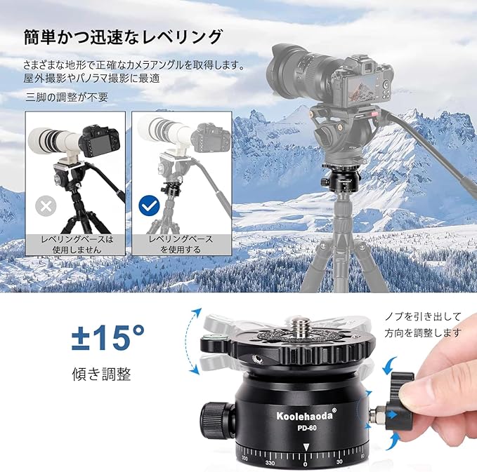 360度水平回転の三脚レベリングヘッド。360度回転のパノラマ撮影に使用でき、360度のパノラマ全体を撮影できます。 屋外の旅行写真家にとって絶対に不可欠です。