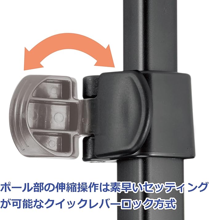 〇ポール部の伸縮操作はレバーによりワンタッチでおこなるクイックレバーロック式。