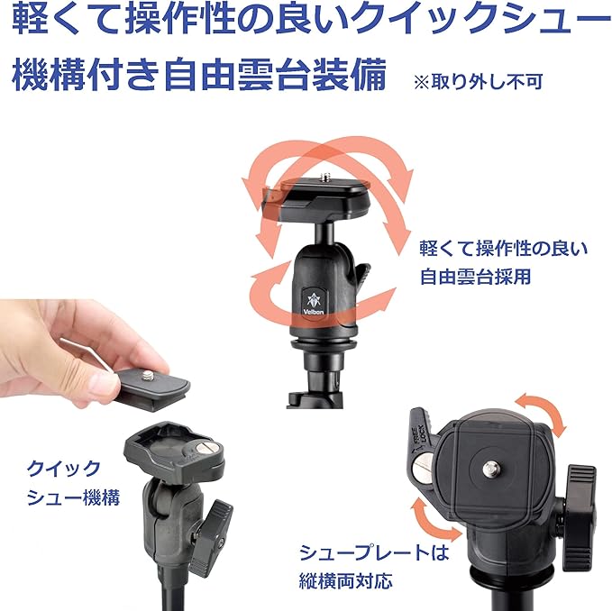 雲台には軽くて操作性の良い自由雲台(ボールヘッド)を採用。カメラの着脱がワンタッチで可能なクイックシュー機構搭載。
