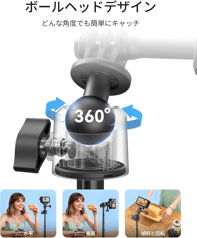 【360 回転可能・長さ自由調整】 この多機能延長棒は 18~46cm に伸縮可能で、360 回転式ボールヘッドを搭載しています。撮影ニーズに応じて角度と長さを自由に調整でき、俯瞰撮影、仰角撮影、水平撮影など、多角度のクリエイティブ撮影を簡単に実現できます。また、カメラ縦撮りモードに対応する机位カードスロット設計が採用されており、ショートビデオ撮影、ライブ配信、Vlog 制作など、多様な撮影ニーズに対応しています。