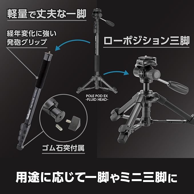 ベルボン Velbon スタンド型一脚 ポールポッド EX フリュードヘッド AZ 4段 レバーロック 脚径23mm フリュード雲台 ビデオ雲台 クイックシュー対応 アルミ脚 卓上三脚へ組み換え可能 Pole Pod AMZPPODEX-FLHD | KAZESHOP