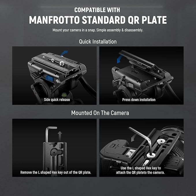 【幅広い互換性と簡単なアクセサリーマウント】Manfrottoに対応でき、1/4インチ-20と3/8インチ-16のネジが付いたクイックリリースプレート(内蔵レンチ)は、さまざまなデジタル一眼レフカメラ、ミラーレスカメラ、ビデオカメラ、ジンバル、ビデオ リグなどに対応できます。側面の 1/4 インチネジは、モニター、LED ライト、マジック アームなどの外部デバイスを拡張するためのアクセサリを接続します。