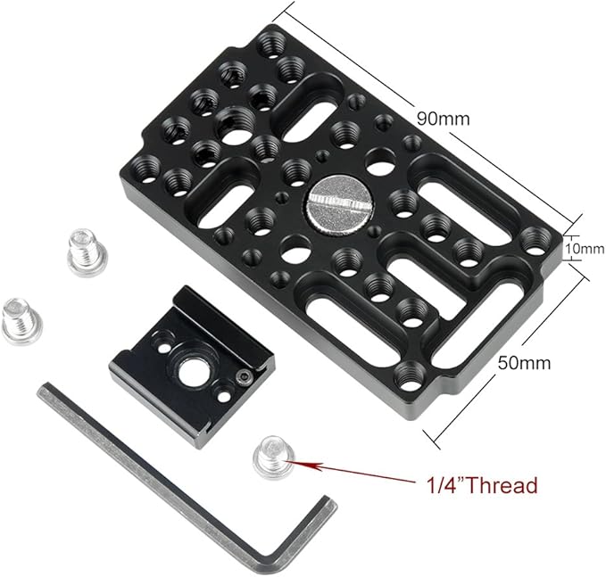 【広い範囲を使用ができる】連続プレートは1/4インチのネジ穴、3/8インチのネジ穴、M3ネジ穴 、M4ネジ穴、1/4インチのシンクホールが付いて、複数ネジ穴の設計なので、ロッド、 アーム、バッテリ、コンバータボックス等様々なカメラアクセサリーを装着可能です。(ネジ穴間隔は9mmので、もっとシンプルと直観に利用ことができます。)汎用性だけで無く安定性、機能性にも優れています。用途に合わせ調整できます。プロやアマチュアを問わず、カメラマン/映画製作者のための適当な機材です。