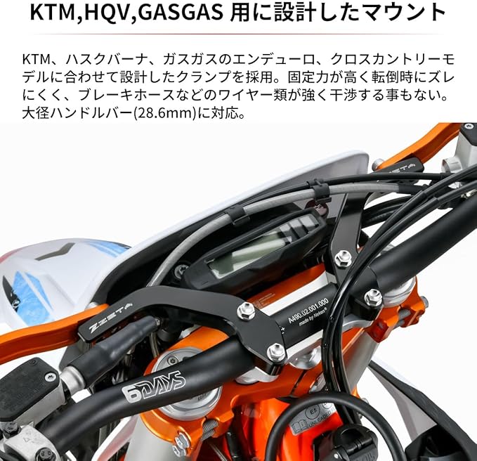 KTM、ハスクバーナ、ガスガスのエンデューロ、クロスカントリーモデルに合わせて設計したクランプを採用。固定力が高く転倒時にズレにくく、ブレーキホースなどのワイヤー類が強く干渉する事もない。大径ハンドルバー(28.6mm)に対応。