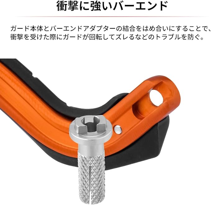 ガード本体とバーエンドアダプターの結合をはめ合いにすることで、衝撃を受けた際にガードが回転してズレるなどのトラブルを防ぐ。