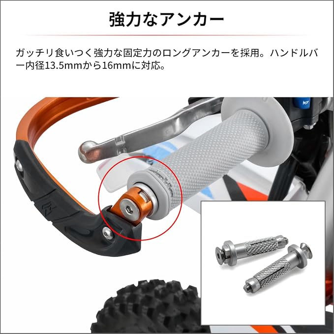 ガッチリ食いつく強力な固定力のロングアンカーを採用。ハンドルバー内径13.5mmから16mmに対応。
