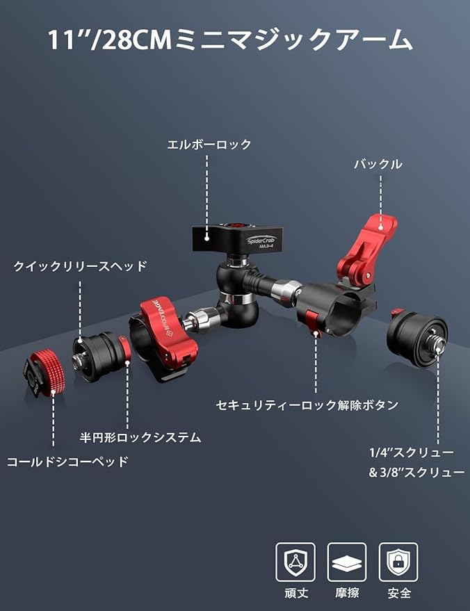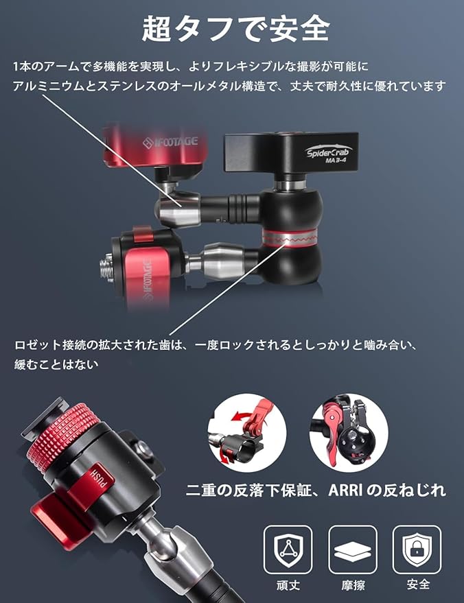 【耐久性、安全性、スピード】オールメタル構造、デュアルセキュリティロック、モジュラー式クイックリリースデザインにより、IFOOTAGE Spider Crab マジックアームズは超耐久性、安全性、スピードに優れています