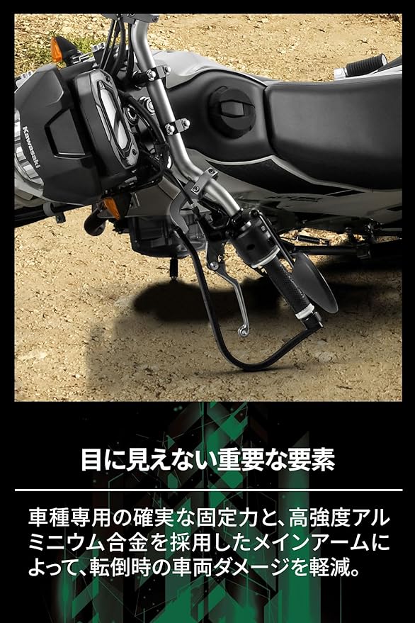 車種専用の確実な固定力と、高強度アルミニウム合金を採用したメインアームによって、転倒時の車両ダメージを軽減。