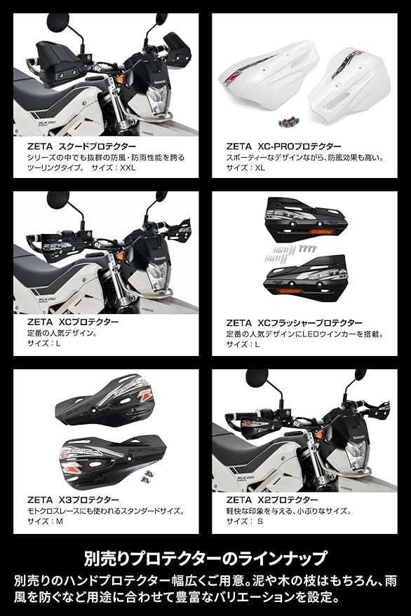 別売りのハンドプロテクターを幅広くラインナップ。泥や木の枝はもちろん雨風を防ぐなど、用途に合わせて豊富なバリエーションを設定。