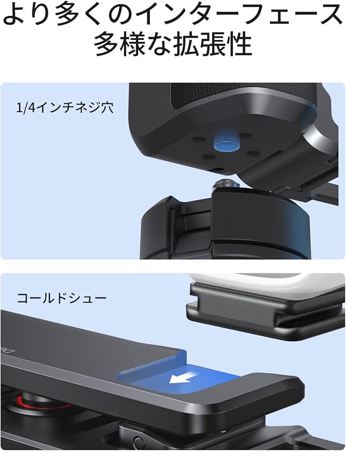 【より多くのインターフェースで、多様な拡張に対応】 ハンドルの底部に 1/4 インチのネジ穴を装備し、コールドシュー付きシャッターボタンの上部にはコールドシューを搭載しています。これにより、マイク、補助ライトなどの各種アクセサリーを外付けすることが可能です。