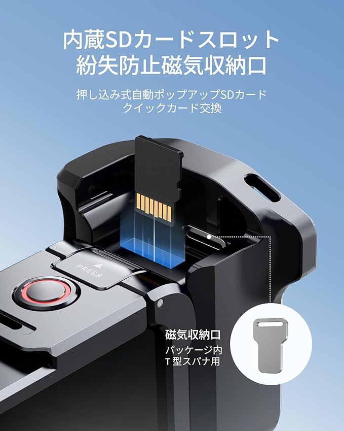 【内蔵SDカードスロット】 グリップに内蔵自動ポップアップ式 SD カードストレージスロットがあり、SD カードを保管できます。押すと SD カードが自動的にポップアップし、素早くカードを交換でき、外出がさらに便利です。グリップにはさらに磁気吸着収納口があり、パッケージ内の金属製 T 型スパナを収納でき、アクセサリーの紛失を防ぎます。