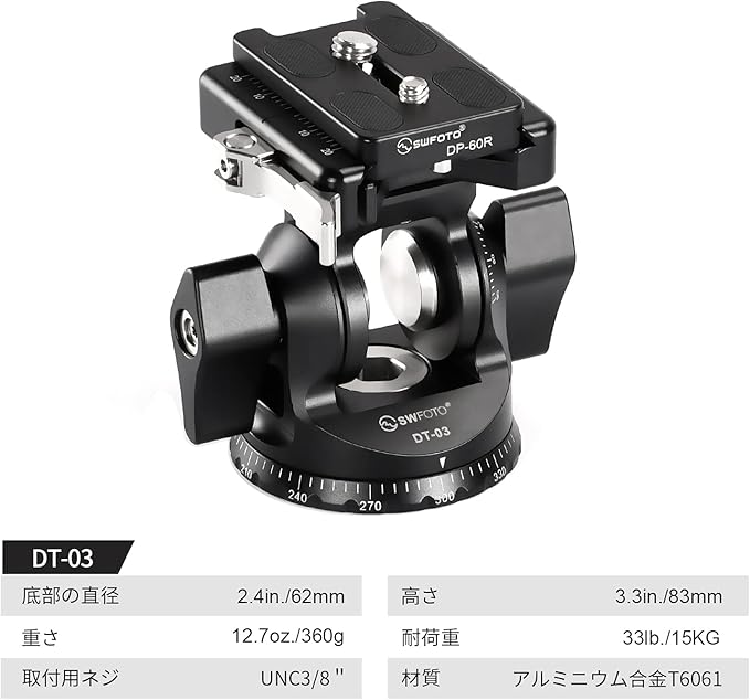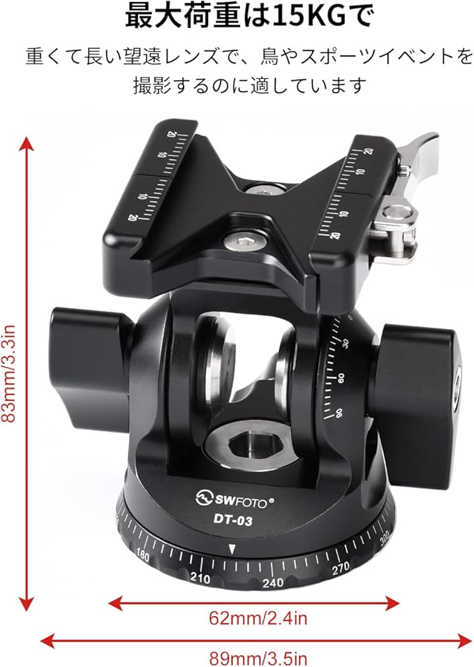✪DT-03二次元雲台は全金属材質、本体はT 6061、主な受力点はステンレス鋼であり、望遠レンズのような大型の撮影装備に適した雲台です。