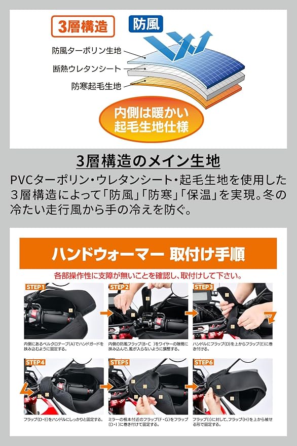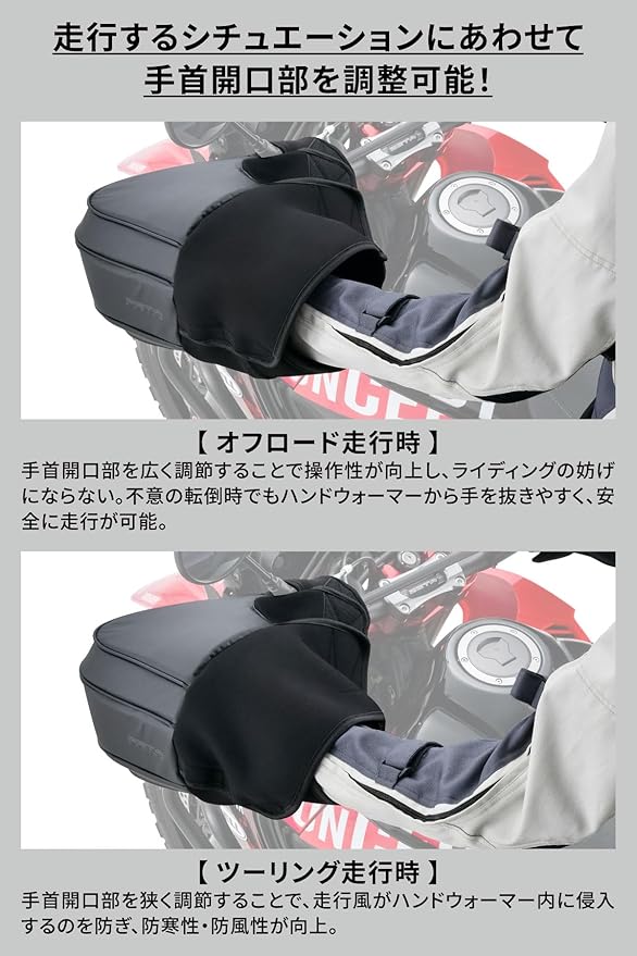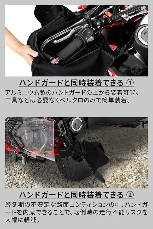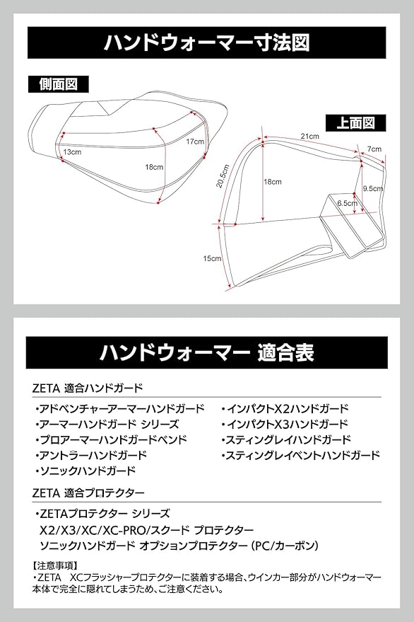 ・本製品はZETAハンドガードに専用設計されたハンドウォーマーです。純正ハンドガードや社外製品に関しては、ハンドガードの大きさや形状によっては取付けができない場合がございます。ハンドウォーマーのサイズをご確認の上、ご検討ください。