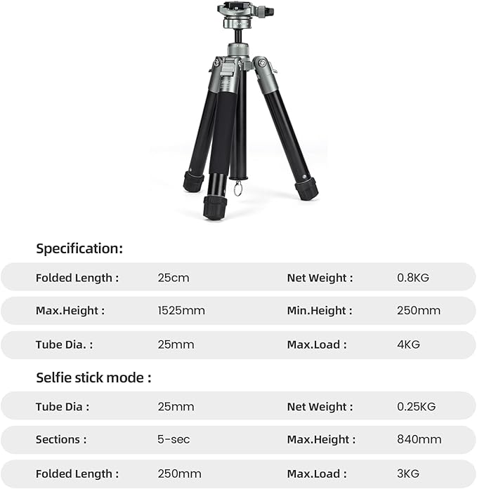 安定性と頑丈さ: 軽量ながら、4KGの耐荷重があり、様々なカメラや機材に対応します。カメラ三脚の脚チューブ径25MM、三脚は高強度アルミ合金製で、すべての撮影ニーズに安定した性能を提供することができます