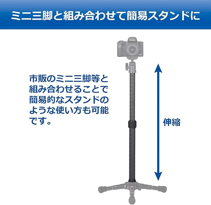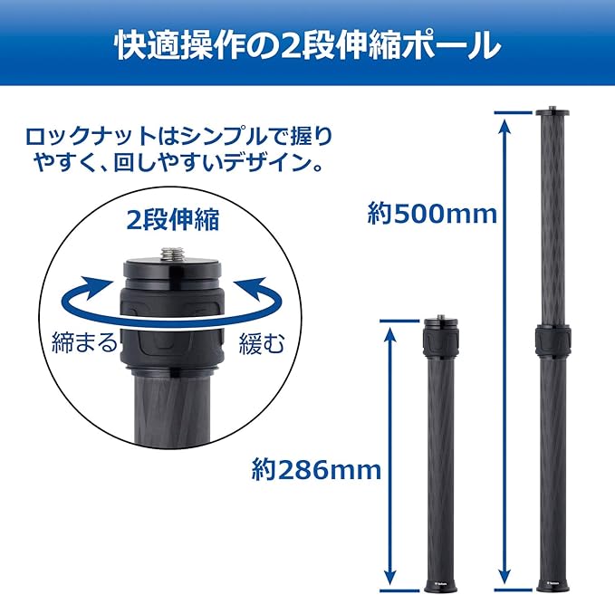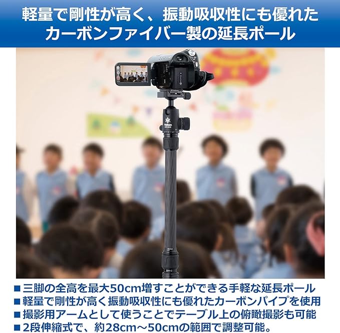 三脚と雲台の間に取り付けて、手軽に高さを増すことができるカーボン製延長ポール。 約50cm 2段伸縮