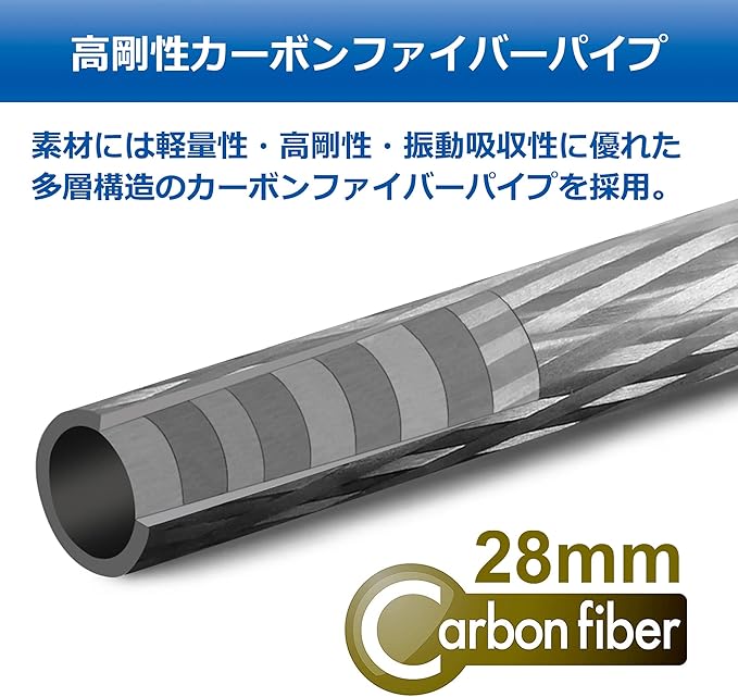 素材には軽量で剛性が高く、振動吸収性にも優れたカーボンファイバーパイプを使用。。内部には空回り 防止機構が施されておりスムーズに伸縮・固定でき ます。素材には軽量で剛性が高く、振動吸収性にも優れたカーボンファイバーパイプを使用。内部には空回り防止機構が施されておりスムーズに伸縮・固定できます。