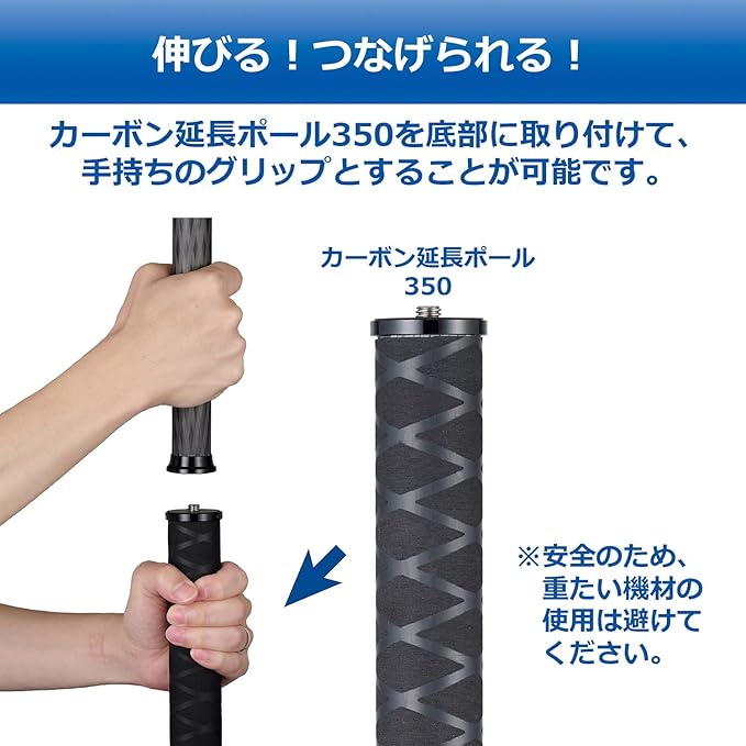 三脚と雲台の間に取り付けて、手軽に高さを増すことができるカーボン製延長ポール。約50cm 2段伸縮 イベント撮影時、後方から観客の頭上越しに撮影する際や、フェンス等の障害物で三脚全高が足りない場合などにエレベーター部に取り付けし高さを増すことが出来ます。 素材には軽量で剛性が高く、振動吸収性にも優れたカーボンファイバーパイプを使用。内部には空回り防止機構が施されておりスムーズに伸縮・固定できます。 三脚や他の撮影機材と組み合わせることで、通常では撮りにくい「テーブル上を真上から撮る(俯瞰撮影)」ことが可能になります。 【商品仕様】 全長:約500mm縮長:約214mm 伸縮ストローク:約214mm 台座径(上/下):約36mm/36mm 段数および脚径:2段、約28mm/25mm 質量:約156g 想定積載質量:三脚使用時の垂直方向:2.5kg 上記以外:1kg カメラネジ:UNC1/4(細ネジ)、 UNC3/8(太ネジ)両サイズ対応 三脚取付ネジ穴:UNC1/4(細ネジ)、 UNC3/8(太ネジ)両サイズ対応