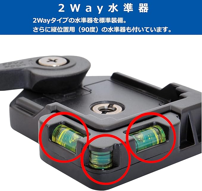 左右+上下方向の水平が確認できる、2Wayタイプの水準器を標準装備。さらに縦位置用(90度)の水準器も付いています。