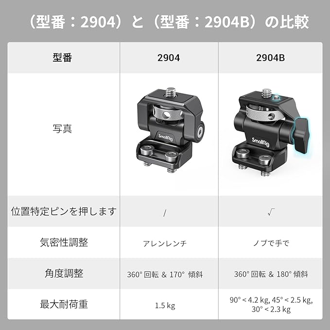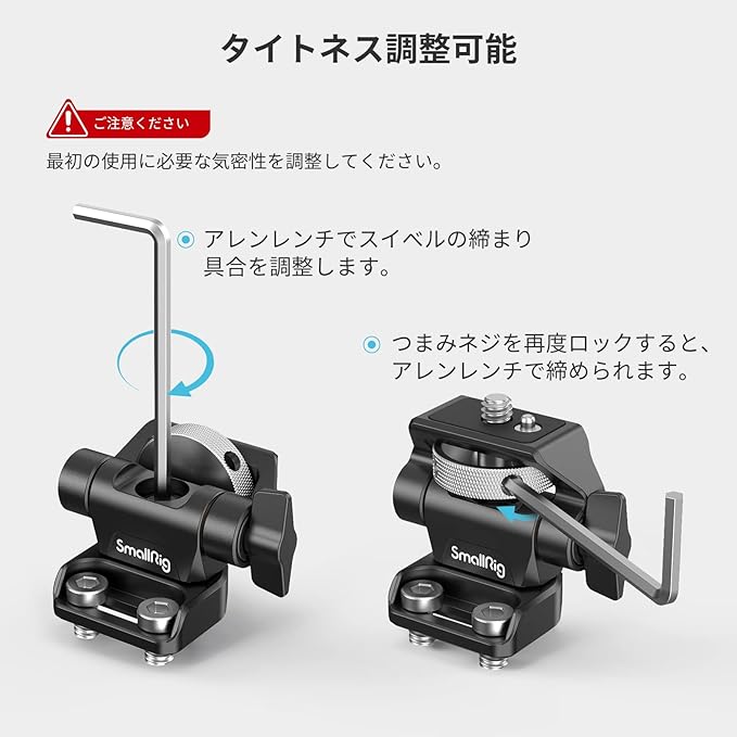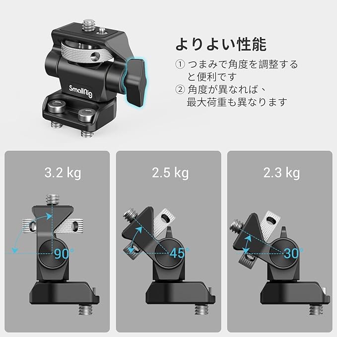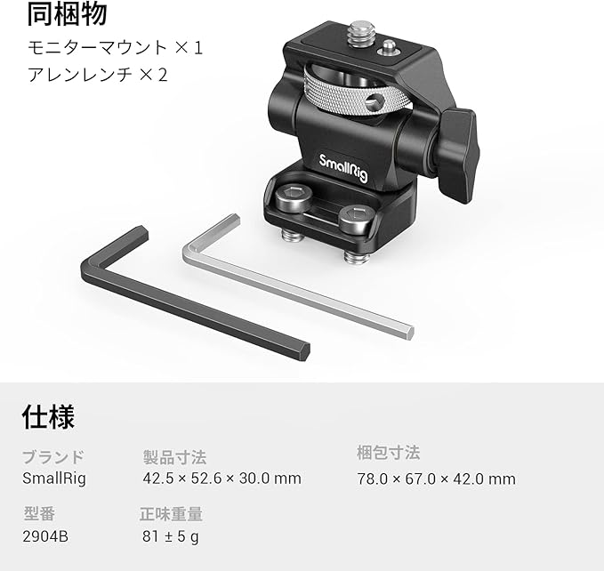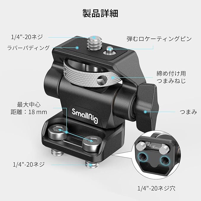 【5"および7"モニター用】SmallRigスイベルおよびチルト調整可能なモニターマウント2904Bは、カメラケージ、ハンドル、またはその他の取り付けシステムなどのアクセサリに1/4"-20ネジでモニターを保持するように設計されています。ネジ式と互換性があります。 穴の中心距離は18mm以下になります。