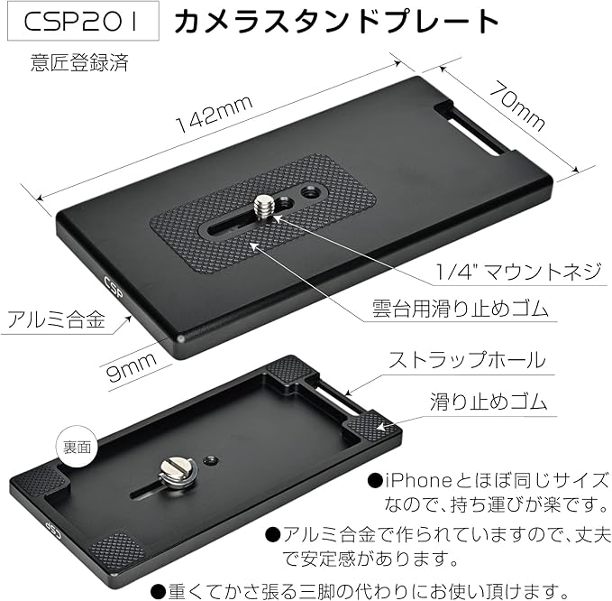 【商品の仕様】サイズ:W142 D70 H9mm/重さ:138g/材質:アルミ合金、裏面滑り止めゴム/付属:1/4inchマウントネジ