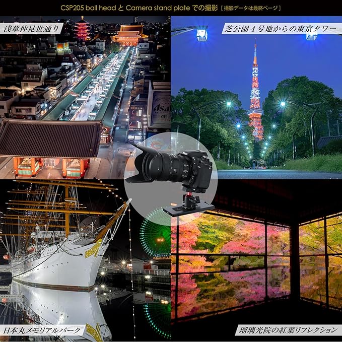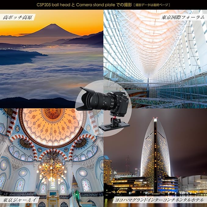 【注意事項】①三脚禁止の場所でも使用できますが、固定器具禁止の場所もありますので、現場の撮影ルールをお守りください。②不安定な場所では、しっかりと設置されていることを確認し、必ずカメラストラップを身につけてご使用ください。③マウントネジ部分の耐荷重は15kg以上ありますが、この商品は2kgまでの機材を載せるように作られていますので、これ以上の重さの機材は載せないでください。④カメラスタンドプレート(CSP201)は、CSP205の低重心自由雲台をお勧めいたしますが、お手持ちの雲台をお使いの場合は、ストッパーやロックノブがプレートに干渉しないかご確認のうえご購入ください。⑤三脚のように上下に可動はいたしません。テーブルなどを利用して高さ調節してください。⑥本来の目的以外の用途に使用しないでください。