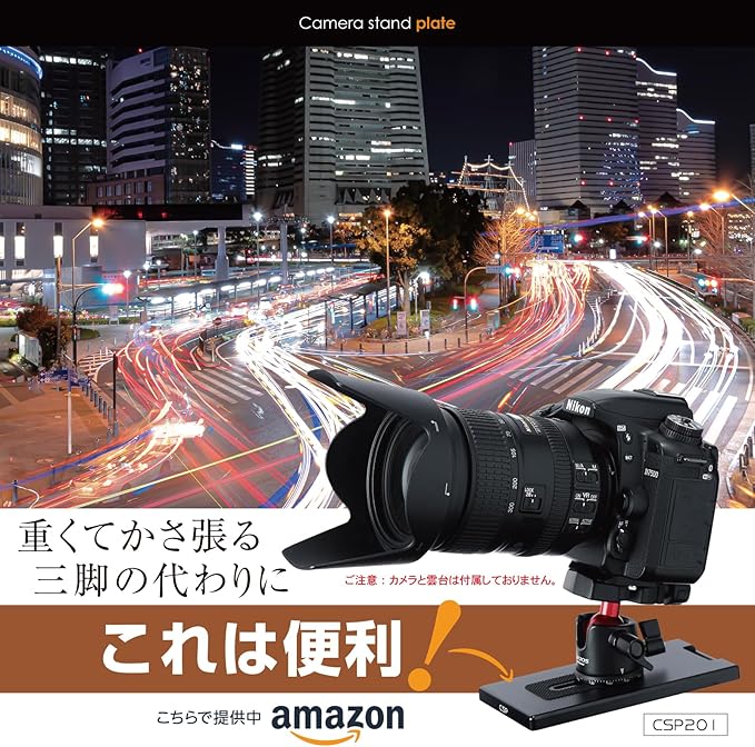 【改良版カメラスタンドプレート《意匠登録済》】アクリル樹脂からアルミ合金になってさらに丈夫で安定性が増しました!カメラスタンドプレート(CSP201)にお手持ちの雲台(CSP201と相性の良いCSP205をお勧めします)とカメラを取り付ければ三脚の代わりに夜景撮影、ローアングル撮影、長時間露光撮影、自撮り、集合写真などにお使いいただけます。