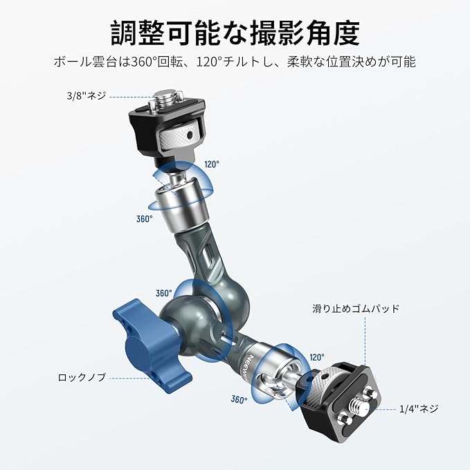 【360 回転&120 チルト】マジックアームカメラマウントは、各関節式アームにUノッチ付きのボールヘッドを搭載しており、360 回転と120 チルトが可能です。大型レバーで任意の角度に固定できるため、安定性と正確な位置決めを実現します。