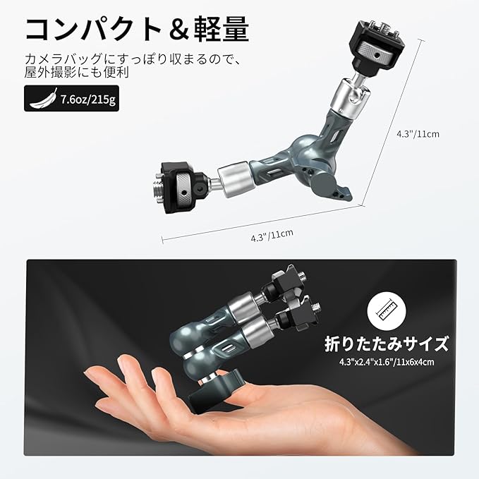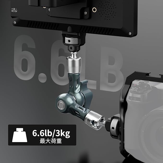 【1/4"と3/8"取り付けオプション】1/4"と3/8"のトップネジは、DSLRミラーレスカメラ、LEDビデオライトパネル、ウェブカメラ、マイク、フィールドモニター、iPhone対応スマホホルダー、アクションカメラマウントアダプターアクセサリー、Osmo Pocket 3/2などへの取り付けに使用できます。スーパークランプ(別売)を使用して、マジックアームをカメラケージ、三脚、一脚、スライダー、その他のリグに直接接続することもできます。最大荷重は3kgです。