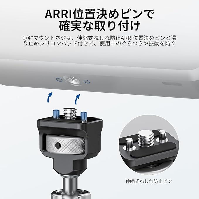 【ねじれ防止の二重安全設計】各マジックアームの上部には格納式のねじれ防止ピンと、使用中のぐらつきや振動を防ぐ滑り止めシリコンパッドが付いています。さらに、つまみネジは位置決め穴でさらに固定できるため、安定性と信頼性の高いセットアップを実現します。写真撮影とビデオ撮影に最適です。コンテンツクリエイターにとって必要なアクセサリー、そしてインフルエンサーにとって必要なカメラギアとして最適です。