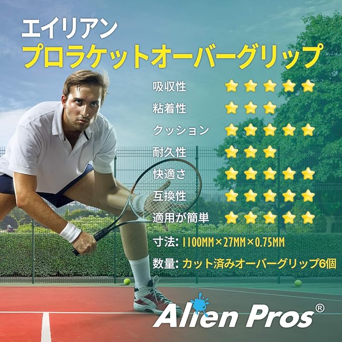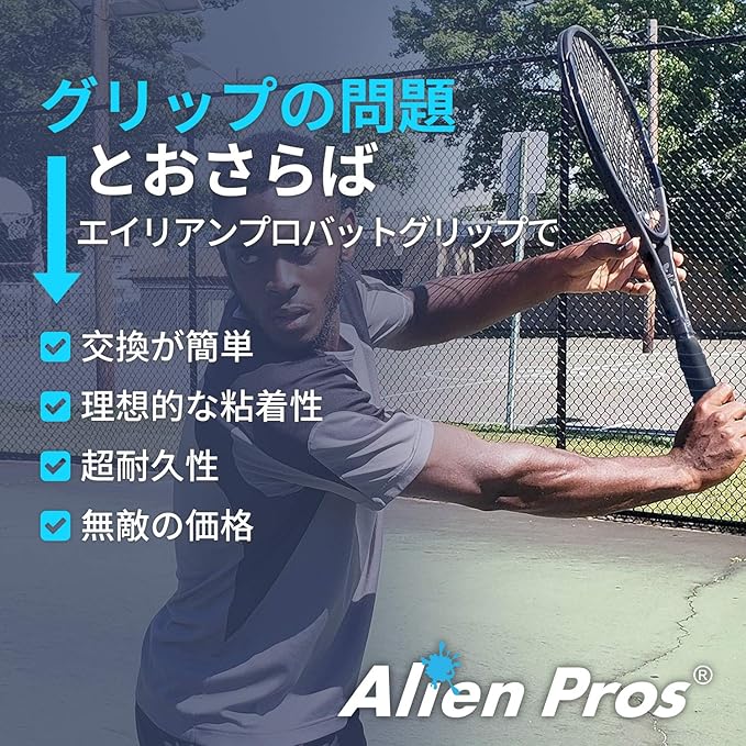 テニスプレイヤーによるテニスプレイヤーのための、吸水性抜群のドライタイプ。Alien Pros テニスグリップは、汗をしっかりと吸収し、滑らないようドライな感触を提供します。