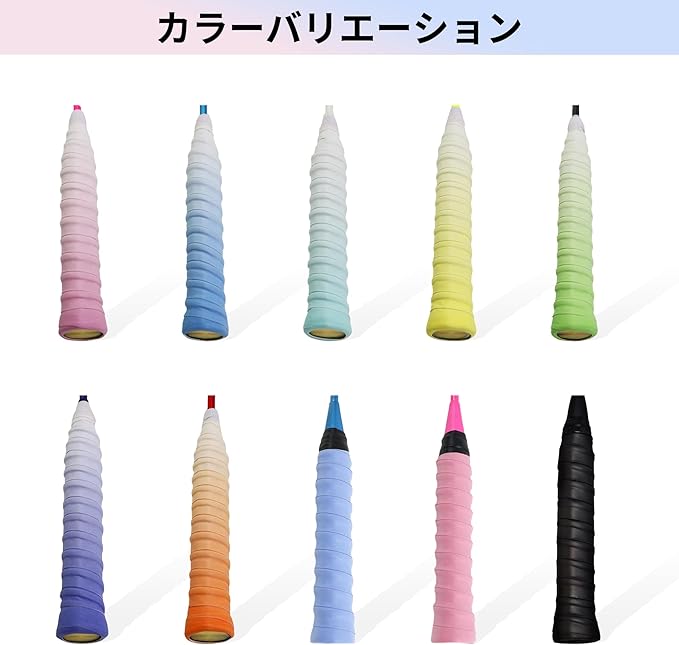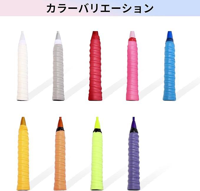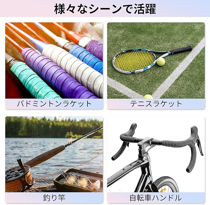 テニス、バドミントンなどのラケットスポーツに適した多目的アクセサリーで、オーバーグリップや交換テープとしても使用できます。さまざまなスポーツや機器のニーズに柔軟に対応します。