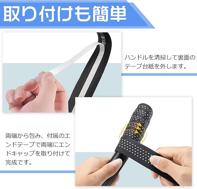 【取り付け簡単】 汎用性の高いデザインなので、幅広く自転車のハンドルに適用します。 エンドキャップ、エンドテープも付属していますので、工具が不要で先端と末端の処理を簡単にできます。※取り付け方法:①ハンドルを清掃します。②ハンドルの両端から包みながら、すごし張力を維持します。③張力を調整しながらハンドルを包みます。④付属のエンドテープで固定して、両端にエンドキャップを取り付けて完成です。