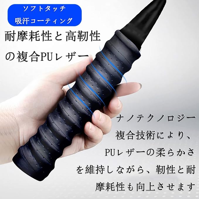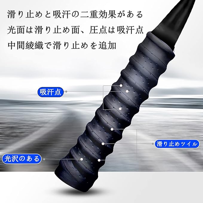 【滑り止め】グリップの表面は凹凸型で、衝撃を軽減します。汗を効果的に吸収できる小さな穴がたくさんあるグリップテープ、滑り止めとしても機能します。