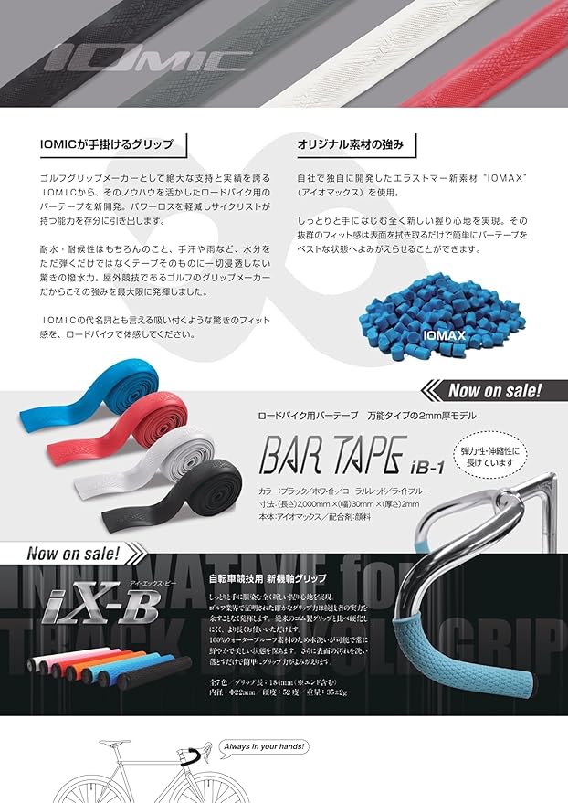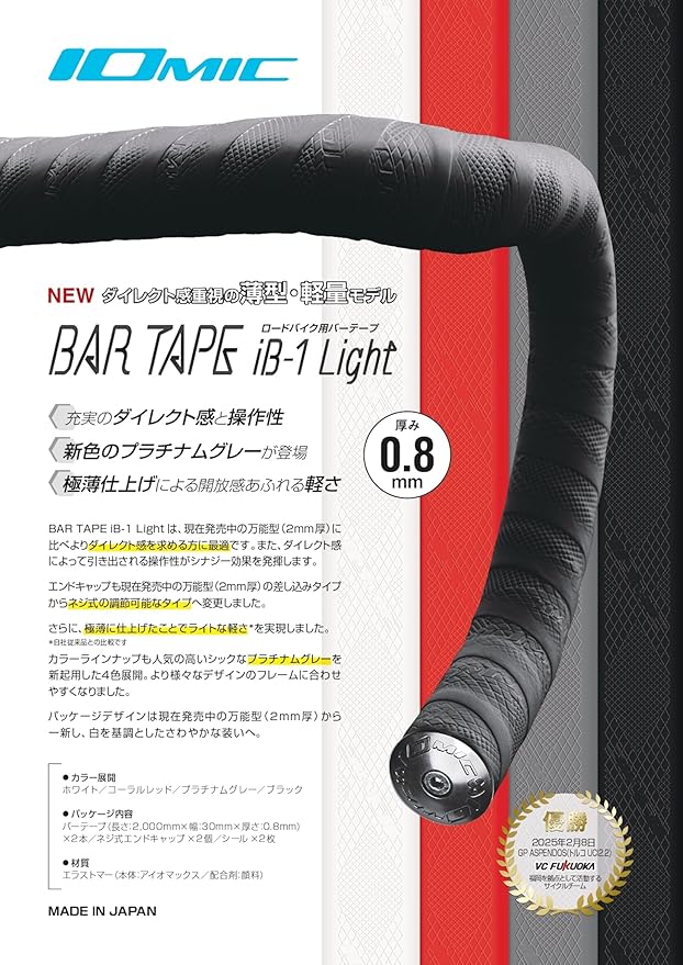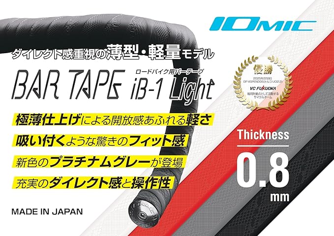 IOMIC(イオミック) iB-1 Light ロードバイク用バーテープ ブラック 1台分 サイズ:長さ2000mm 幅30mm 厚さ0.8mm ●付属品:バーテープ 2本、ネジ式エンドキャップ 2個、シール 2枚