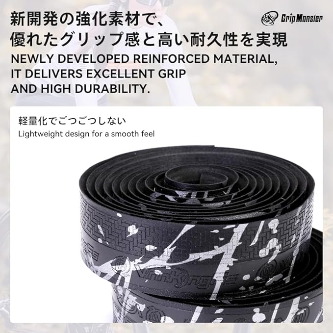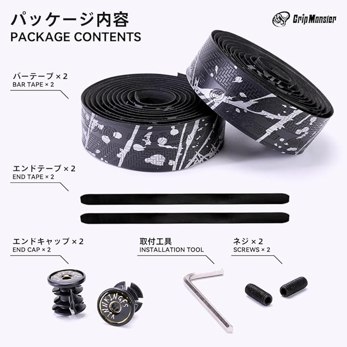 【簡単取り付け】 高品質の両面テープにより、ハンドルに巻きやすくなり、巻いた表面も美しく整います。バーエンドテープとエンドキャップも付属していますので末端の処理も簡単です。初めての方でも手軽に取り付け可能です。【ご注意】バーテープを取り付けた後は、必ずしっかり固定されているかご確認ください。取り付けが不十分な場合、走行中に外れる恐れがあり危険です。