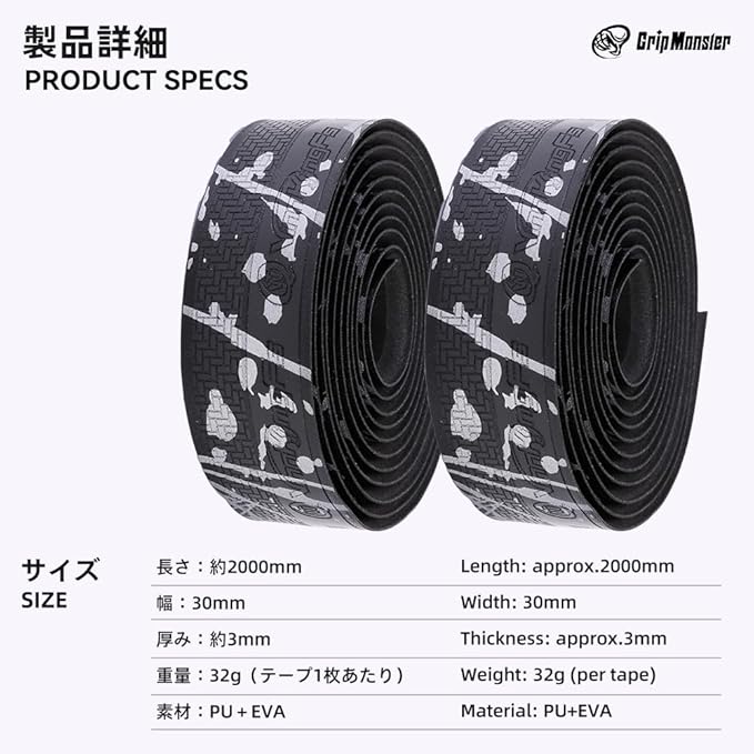 【商品仕様】 素材:強化PU+EVA サイズ:厚さ 3mm、長さ 2000mm、幅 30mm 付属品:バーテープ 2、バーエンドキャップ 2、バーエンドテープ 2 重量:約32g(1本あたり)