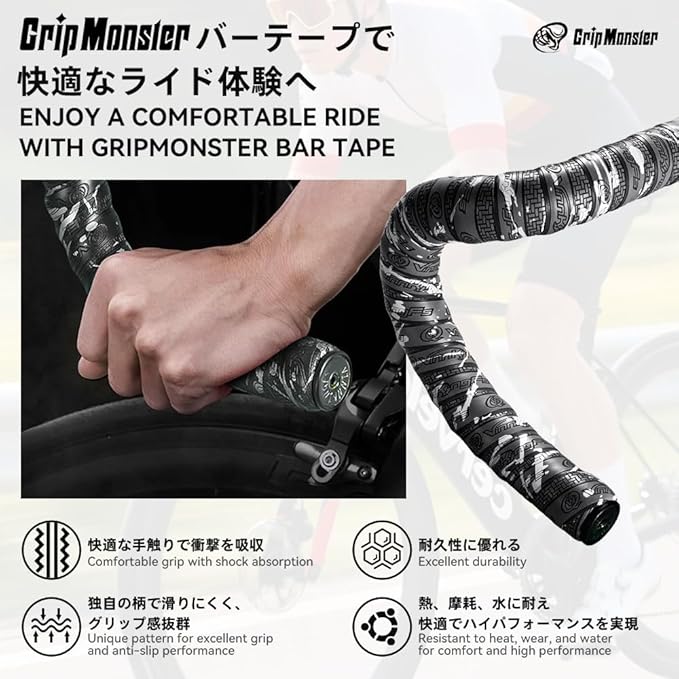 【圧倒的なグリップ感】 滑り止め加工と衝撃吸収性能を兼ね備えたハンドルバーテープです。路面からの振動を和らげ、感触も伝えられます。握力不足によるエネルギー損失を抑え、コントロール精度を高めるため、高速のコーナリングや直線スプリントでも安全で安定した操作感を実現します。