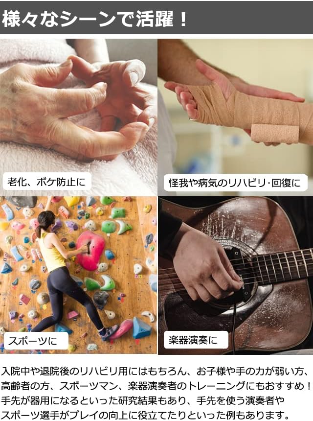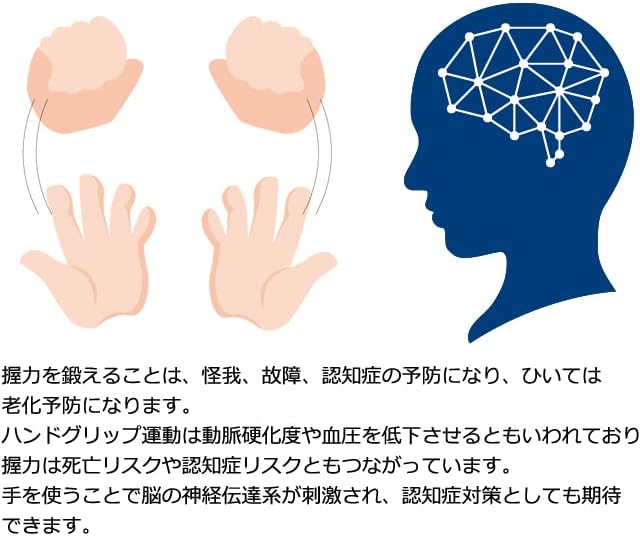 入院中や退院後のリハビリ用にはもちろん、お子様や手の力が弱い方、高齢者の方、スポーツマン、楽器演奏者のトレーニング、エクササイズにもおすすめ!握力を鍛えることは、怪我、故障、認知症の予防になり、ひいては老化予防になります。ハンドグリップ運動は動脈硬化度や血圧を低下させるともいわれており、「握力」は死亡リスクや認知症リスクともつながっています。手を使うことで脳の神経伝達系が刺激され、認知症対策としても期待できます。手先が器用になるといった研究結果もあり、手先を使う演奏者やスポーツ選手がプレイの向上に役立てたりといった例もあります。