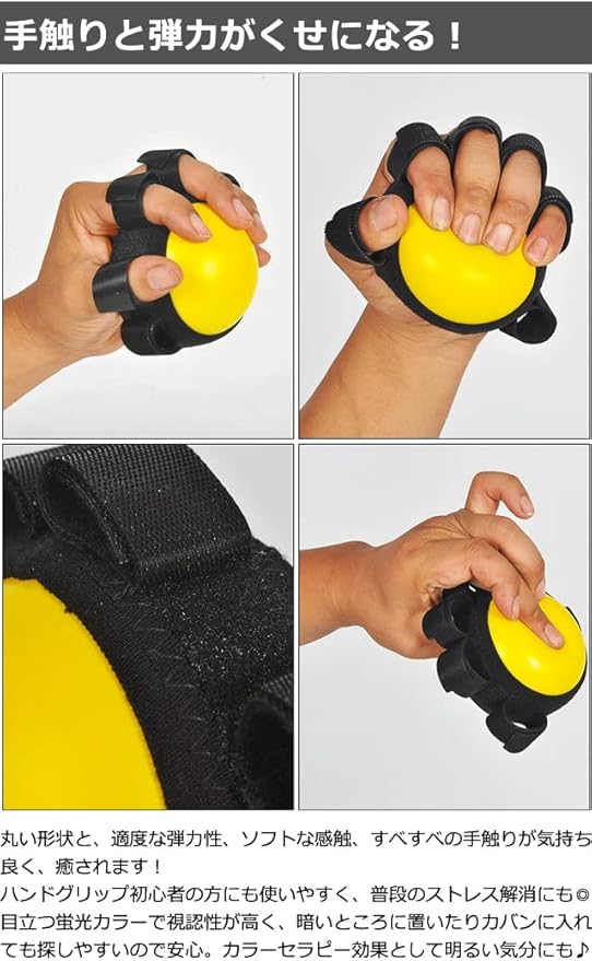 丸い形状と、適度な弾力性、ソフトな感触、すべすべの手触りが気持ち良く、癒されます!ハンドグリップ初心者の方にも使いやすく、普段のストレス解消にも◎目立つ蛍光カラーで視認性が高く、暗いところに置いたりカバンに入れても探しやすいので安心。カラーセラピー効果として明るい気分にも♪握って開いて気軽にストレッチ!指固定のテープ部分は6箇所あり、左右兼用で使えます。軽量で持ち運びしやすいサイズ感ですので、おうちでテレビや新聞を見ながらや、就寝前、学校・オフィスでの休憩中、お出かけ時の移動中、待ち時間など、気楽に隙間時間を使って「ながら運動」できます。オフィスワーカーなど、普段PCの入力作業などで手指が凝り固まってしまっている方、日常、スマホの使いすぎで疲れを感じている方のリフレッシュにも効果的。※片手用で、単品1個の販売です。