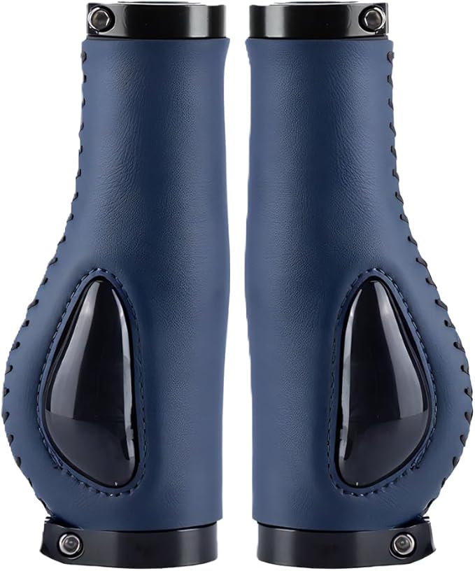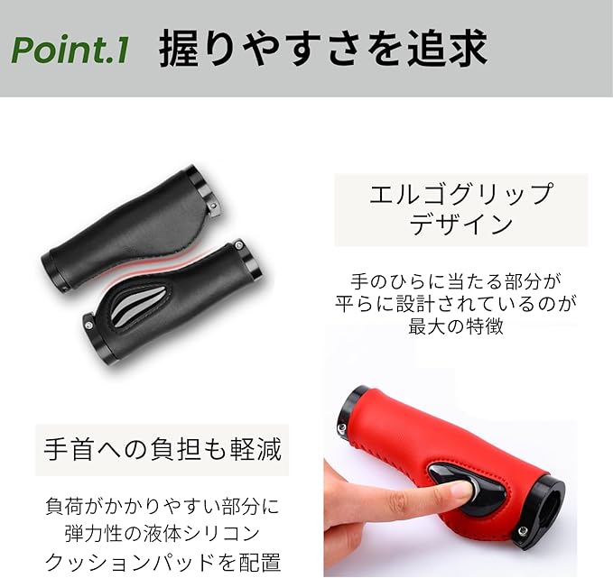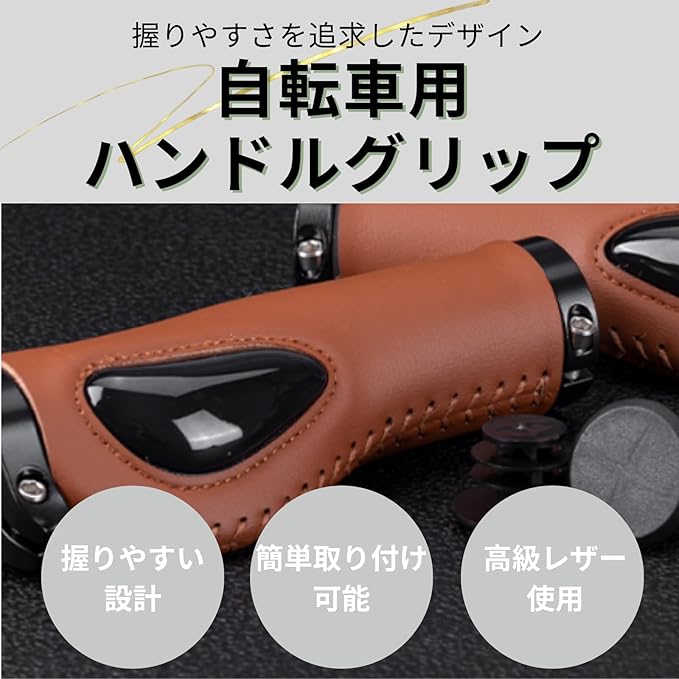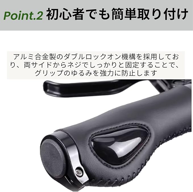 【自転車用グリップ】エルゴグリップデザインを採用した自転車グリップです。従来の丸いグリップとは違い、手のひらに当たる部分が平らに設計されているのが最大の特徴です。接触面積を大幅に拡大しことにより、圧力が一点に集中するのを防ぎます。さらに負荷がかかりやすい部分に弾力性の液体シリコンクッションパッドを配置し、手首への負担も軽減してくれます。【簡単取り付け】アルミ合金製のダブルロックオン機構を採用しており、両サイドからネジでしっかりと固定することで、グリップのゆるみを強力に防止します。しっかりとした固定力が特徴でありながら、取り付け・着脱は非常に簡単で、初心者の方でも手間なく交換できます。【高品質レザー】本体のギリップ部分には高品質PUレザーを使用。スタイリッシュなデザインで、見た目だけでなく、心地よい握りやすさと耐久性を兼ね備えています。撥水性にも優れているため、悪天候や汗をかく季節でも快適に使用でき、お手入れがしやすいのも特徴です。